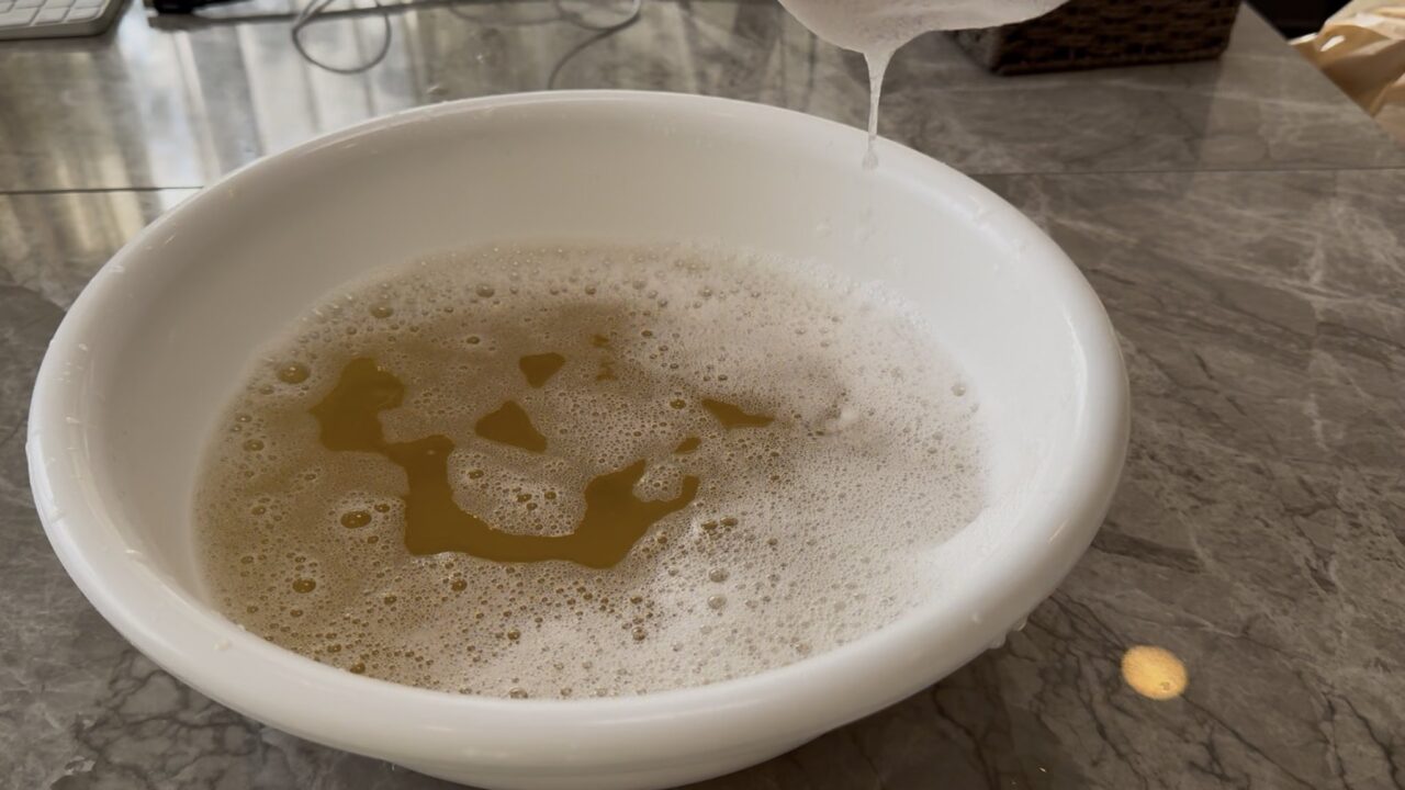 ネットで調べてみると、「中性洗剤を入れたぬるま湯で洗い、日陰干しして、皮専用クリーナーを使う」と書いてあったので、まずは中性洗剤を入れたぬるま湯で洗ってみたところ…