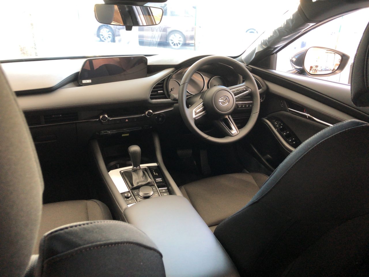 試乗前に展示車をじっくりと見せてもらった。これはスカイアクティブ-Gの1.5だということで、最廉価版だ。しかし、運転席に乗り込んで見てビックリ!